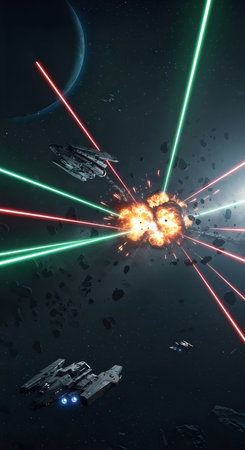 High action scene of space battle between futuristic spaceships with laser beam blast