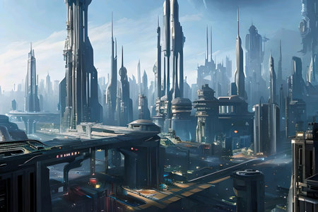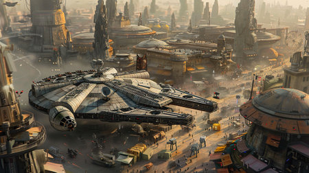 Photorealistic illustration of the urban landscape of Corellia with industrial buildings, starship construction yards, and bustling streets, Star Wars theme, --ar 16:9 Job ID: 80eab8b1-1352-4280-b195-f9b759fe84b4