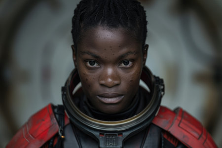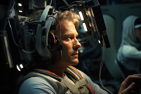 Focused astronaut gazes forward in a spaceship interior.