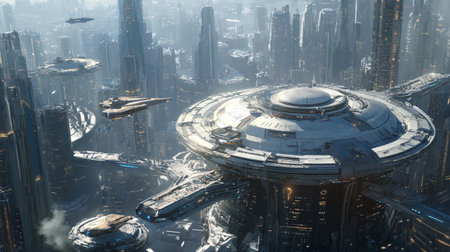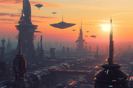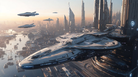 A Futuristic City With a Multitude of Tall Buildings, A spaceport at sunrise with dozens of different spaceships docked, AI Generated