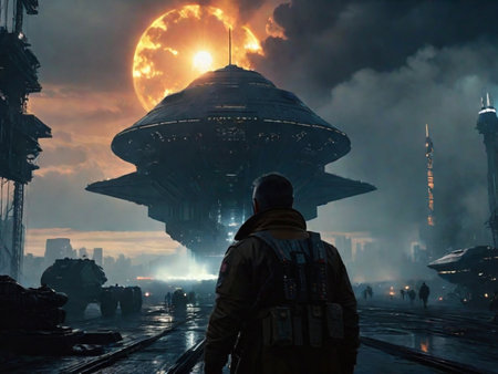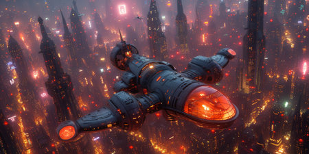 A futuristic spaceship flying over a city with glowing lights, AI