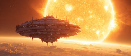 Futuristic Space Station Orbiting Fiery Star. Generative AI