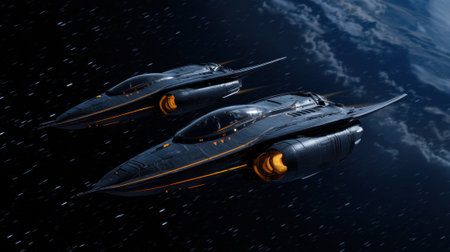 Two sleek, advanced spacecraft travel gracefully through a star-filled space landscape, showcasing their unique design and glowing engines near a distant celestial body.