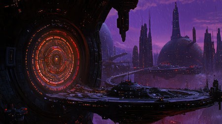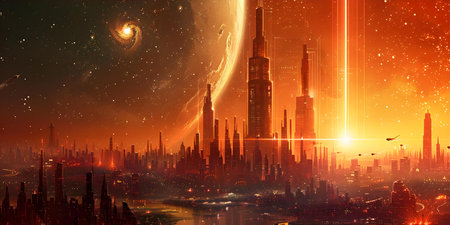 Surreal Futuristic Cityscape with Energy Beam Tower and Intergalactic Planet Landscape. Concept Surreal Futuristic, Cityscape, Energy Beam Tower, Intergalactic Planet Landscape