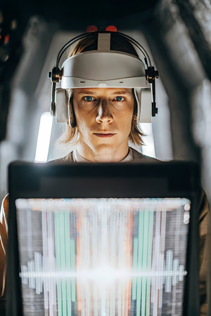 This AI-generated image presents a direct, head-on view of a man with light-colored hair, wearing a sophisticated white and black headset, possibly for brain-computer interface or advanced sensory input. His gaze is intense, directed towards the viewer, conveying focus and engagement. In the foreground, a bright, illuminated screen displays abstract vertical patterns of light in various colors (green, orange, blue), creating a dynamic digital interface. The background is a blurred, dark interior, possibly a futuristic lab or tunnel, with subtle vertical structural elements. This conceptual image, created with artificial intelligence, explores themes of neuroscience, human-computer interaction, advanced technology, data visualization, and immersive digital experiences
