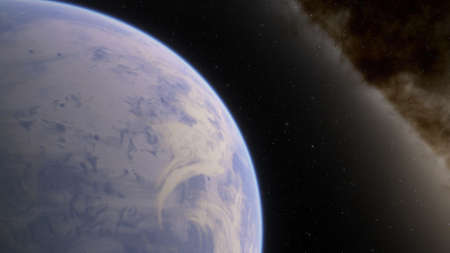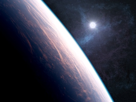 Illustration of a planet with a cloud layer and a sun, nebulae and stars in the background