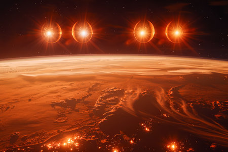 Spectacular Composite Image of Multiple Suns Rising Over Alien Planet's Horizon with Atmospheric Glow AI Generative