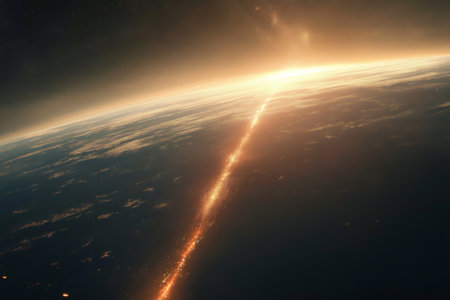Halley's Comet is passing near planet Earth during a beautiful sunrise, creating a breathtaking cosmic scenery