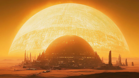A vast alien world showcases a massive sun setting over a dark, dome-shaped city. Towering structures rise from the sandy terrain, casting long shadows in a breathtaking atmosphere.