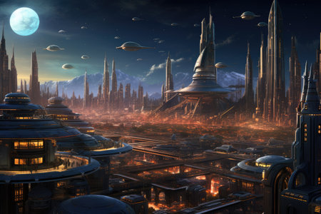 A futuristic space ship is flying over a city at night. The city is lit up with bright lights, creating a moody and mysterious atmosphere. The space ship is the main focus of the image