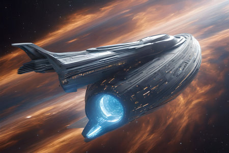 A futuristic spaceship travels through the vast expanse of space
