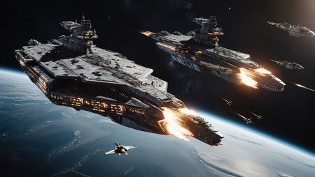 Futuristic sciFi huge battle spaceships. Futuristic sciFi huge battle spaceships concept for futuristic interstellar deep space travel for sci-fi backgrounds. Generative Ai.
