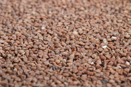 Storage of buckwheat grains indicating food industry packaging, Arrangement of buckwheat groats highlighting volume and quality for commercial food distribution