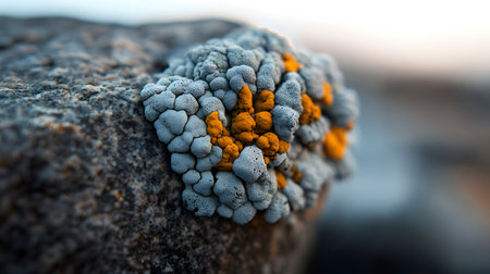 Vibrant orange and blue lichen growing on rocky surface in natural outdoor environment
