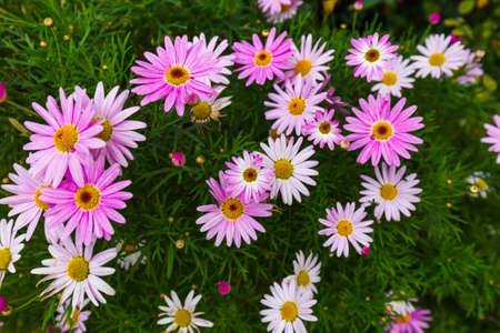 An aerial photo of a field of daisies. The white flowers stand out against the green leaves.