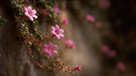 A close-up view of delicate pink flowers climbing a gentle vine, with soft focus background elements, creating a tranquil and serene atmosphere in nature.