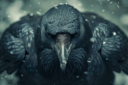 Majestic Black Raven in Snowfall with Detailed Feathers and Piercing Gaze AI Generative