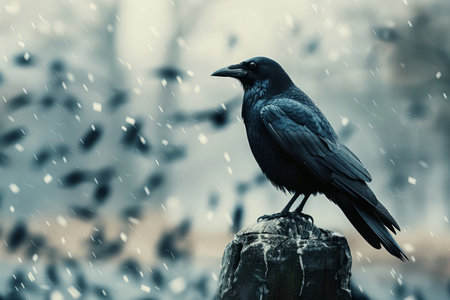 A solitary raven perches on a post during a winter snowfall, with a blurred background of other birds in flight.