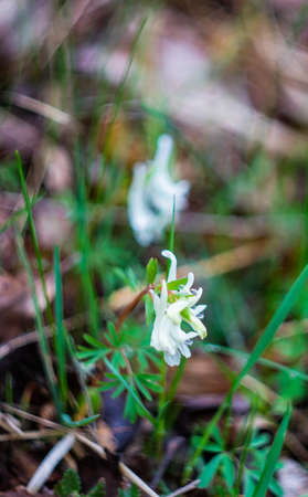 Scenic magical spring forest background of violet and white hollowroot Corydalis cava early spring wild flowers in bloom, with blurred trees in background