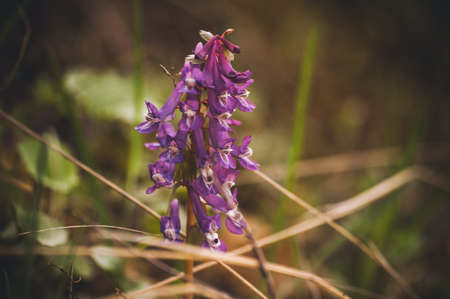 Purple flower Corydalis solida close-up on a blurred background. Shallow depth of field