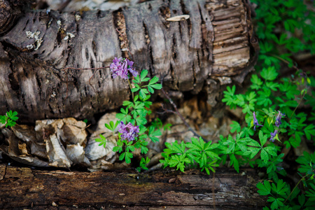 First spring flowers purple bird (fumewort, corydalis solida) among the trees in the forest. Honey and medicinal plants in sunny day