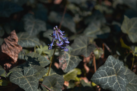 The purple Corydalis blossom in the early spring in a forest with a blurred background and bokeh - Kyiv, Ukraine, Europe.