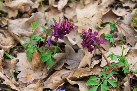 Fist spring flowers primrose Corydalis nepatica, pink colour.