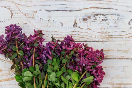 Purple corydalis flowers on white wooden background. First spring flowers. Greeting card for Valentine's Day, Woman's Day and Mother's Day. Top view, copy space