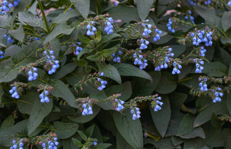 Blue flowers of comfrey with rich green leaves grow on bokeh background with copy space. Small bellflowers in macro. Beautiful plant close up.