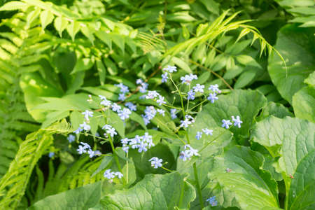 Brunnera macrophylla. Large green leaves and inflorescences with small blue flowers have formed continuous thickets. High quality photo