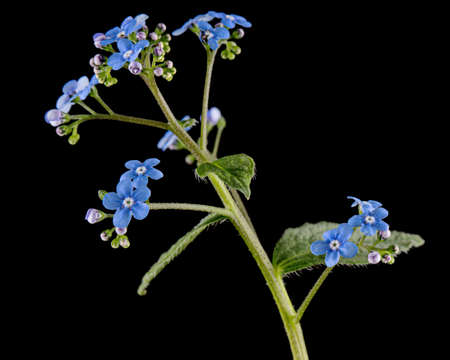 Blue flowers of brunnera, forget-me-not, myosotis, isolated on black background