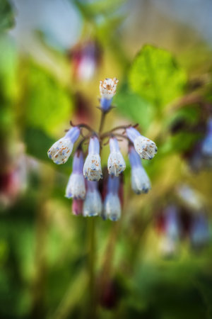 Closeup macro view of wild meadow plant with bunches of little blue, purle and pink flowers like bells, bright pink buds and large green leaves on summer meadow
