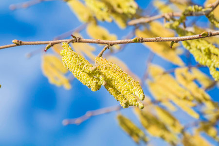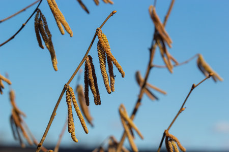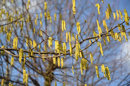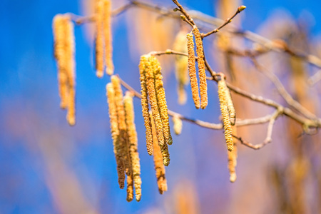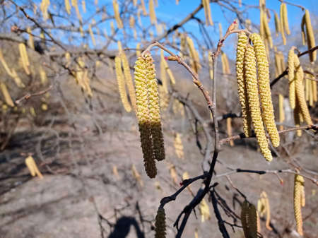 Flowering common hazel shrub (Corylus avellana), yellow male catkins with pollen against a blue sky, first food for bees in spring, but a problem for allergic people, selected focus, narrow depth of field