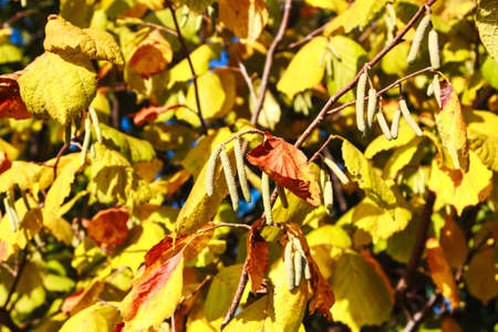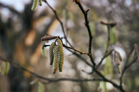 First signs of spring. Hazel, European filbert Corylus avellana opened flower buds and catkins on the eve of spring.