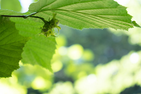 Unripe little green hazelnuts growing on branch on springtime. Corylus avellana tree