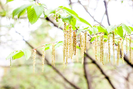 Spring flowers catkins of Common hazel (Corylus avellana) similar to earrings, spring background