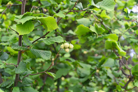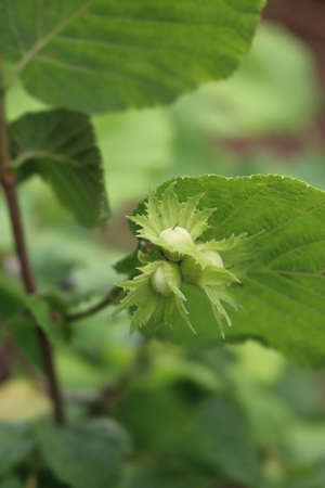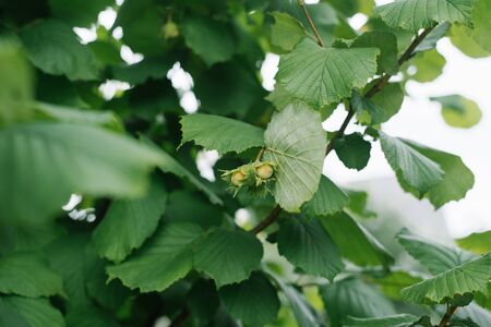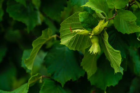 Green Hazelnut growing on a tree in summer.