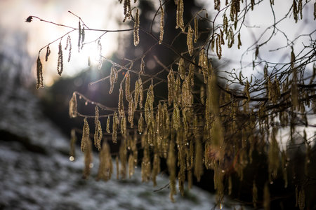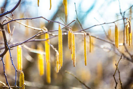 Hazel catkins - Corylus avellana in early spring in sunlight and closeup, highly allergenic pollen