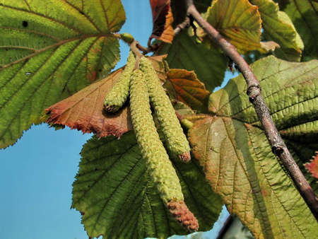 Hazelnut catkins hanging from the tree in the yard