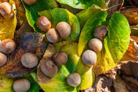 Hazelnuts Among Fall Colored Leaves In The Forest
