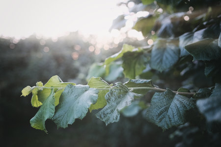 Closeup of hazelnuts growing on a tree, bathed in warm sunlight, lush green foliage
