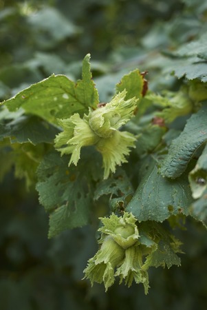 Mature fruits of hazelnut. Hazelnut tree canopy, with young fruit.