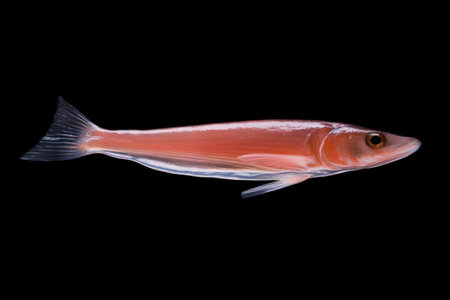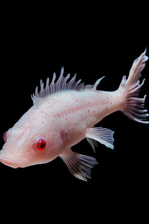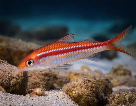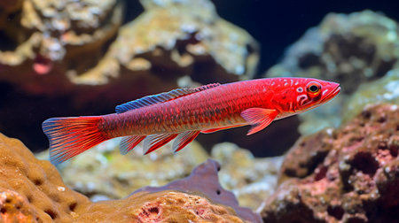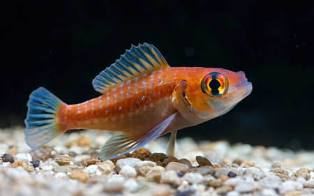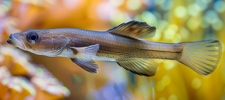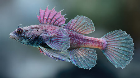 A detailed image presents a colorful fish, showcasing intricate fins and scales. The composition emphasizes the fish's form with a blurred backdrop, enhancing its visual prominence. The image highlights aquatic life, suitable for scientific publications or educational materials, and is applicable for various commercial purposes.