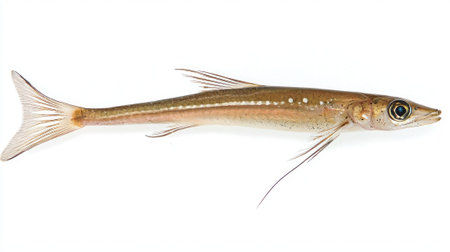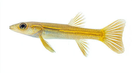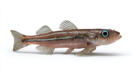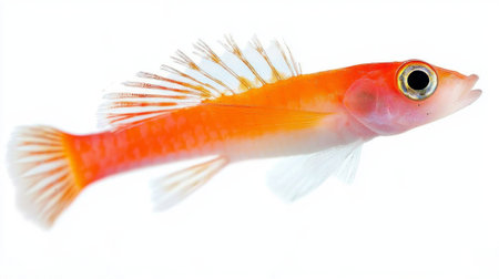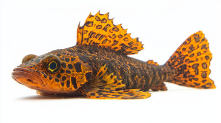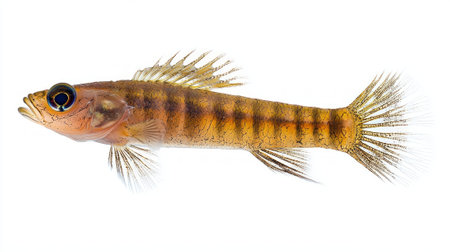 goby fish displays its distinctive features showcasing streamlined body and vibrant coloration captured in high detail against a pure white backdrop.