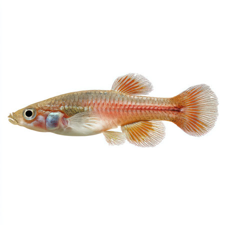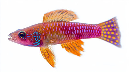 This image features a vibrant freshwater fish showcasing its unique anatomy and bright colors against a clean white background, ideal for educational uses.