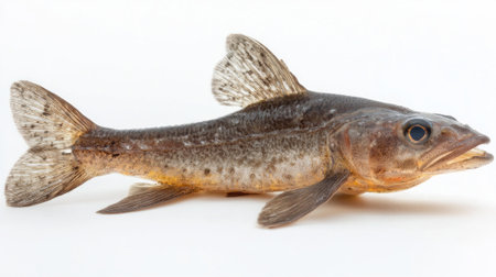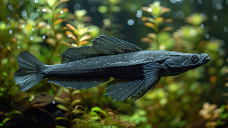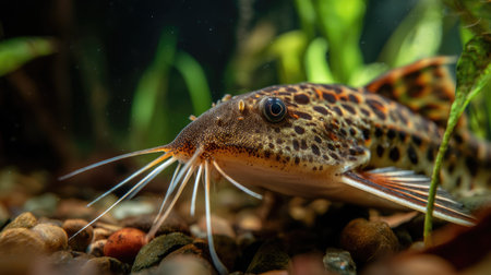 A detailed view showcases an aquatic creature with a speckled pattern and prominent whiskers. The fish is viewed in an underwater environment, with vegetation and small stones. The lighting suggests indoor conditions. This image is suitable for various commercial purposes, including educational materials and design projects.