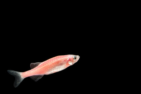 A leopard danio, Danio rerio var frankei, with a dark background.