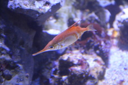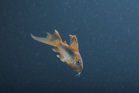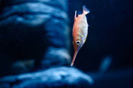 Long fish swimming in aquarium with colorful background in soft focus. Wild sea and ocean nature and animals theme