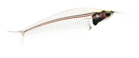 Side view of a Ghost catfish, Kryptopterus minor, isolated on white