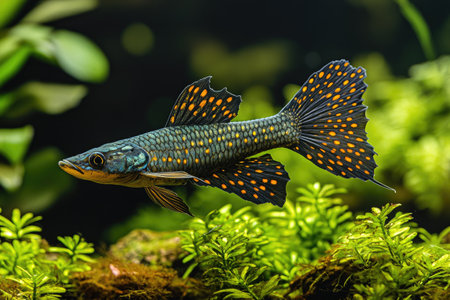 A close-up shot presents a fish with spotted patterns, set within a well-lit aquarium environment. The fish is the central focus, surrounded by aquatic plants and a blurred background. This image highlights natural colors and textures, potentially suitable for educational resources, nature publications, or decorative purposes.